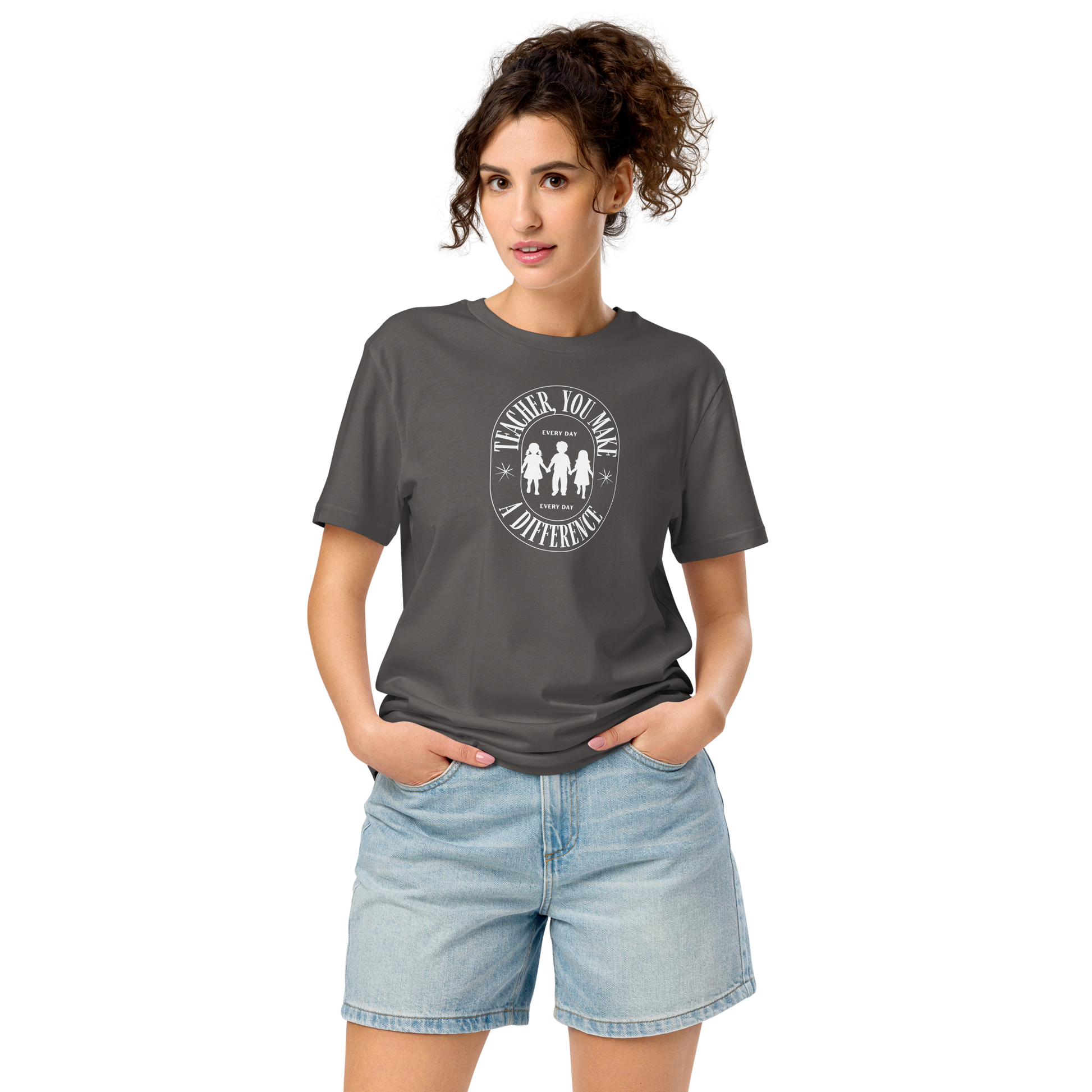 Camiseta adultos gruesa orgánica unisex “Teacher, you make a difference every day” / logo blanco