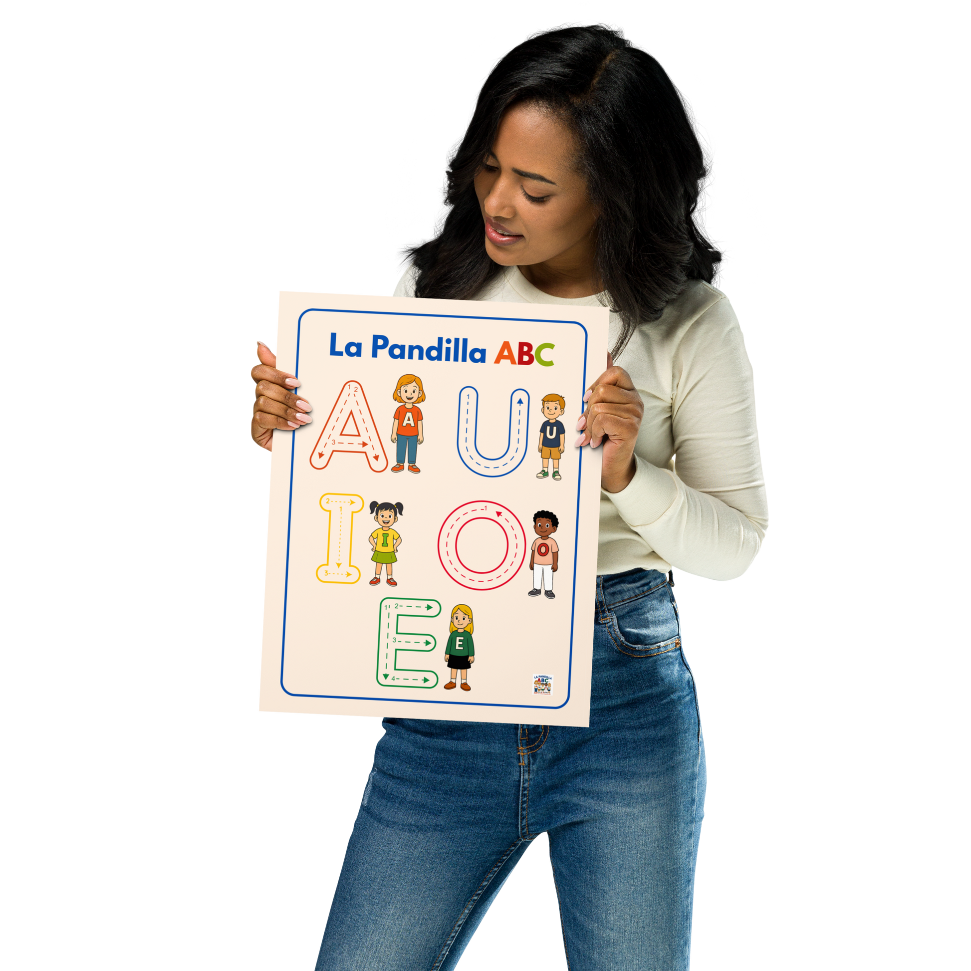 Póster educativo diseñado para ayudar a los niños a aprender el trazo correcto de las vocales A, E, I, O, U. Presenta a los personajes de La Pandilla ABC con líneas de trazo guiadas para practicar la escritura.