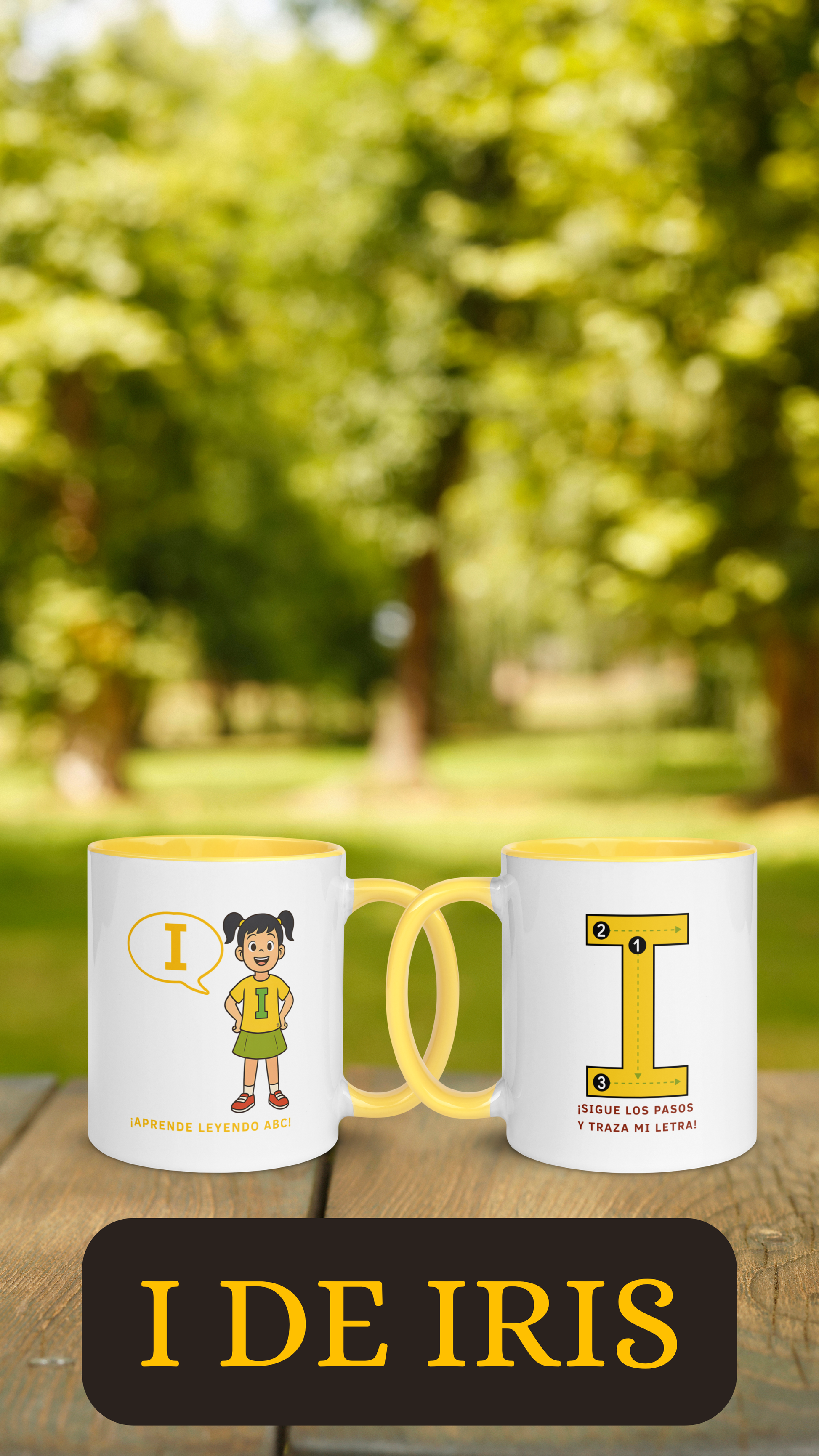 Con el amarillo de Iris, esta taza transmite entusiasmo y curiosidad, reforzando el aprendizaje de la letra I en entornos positivos.